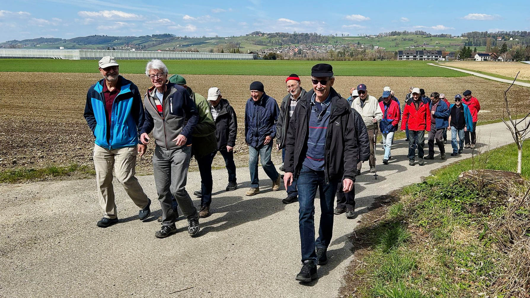 Die elfte Wanderung wurde von Paul Winiger und Karl Sieber organisiert. Die beiden fuhren mit 24 Kollegen per Postauto von Frauenfeld nach Horgenbach. Ab hier marschierten alle gemeinsam bis zum Langfurihof der Gebrüder Truninger. Das Anwesen liegt auf einer leichten Anhöhe, hart an der Kantons-Grenze zwischen Ellikon und Horgenbach.