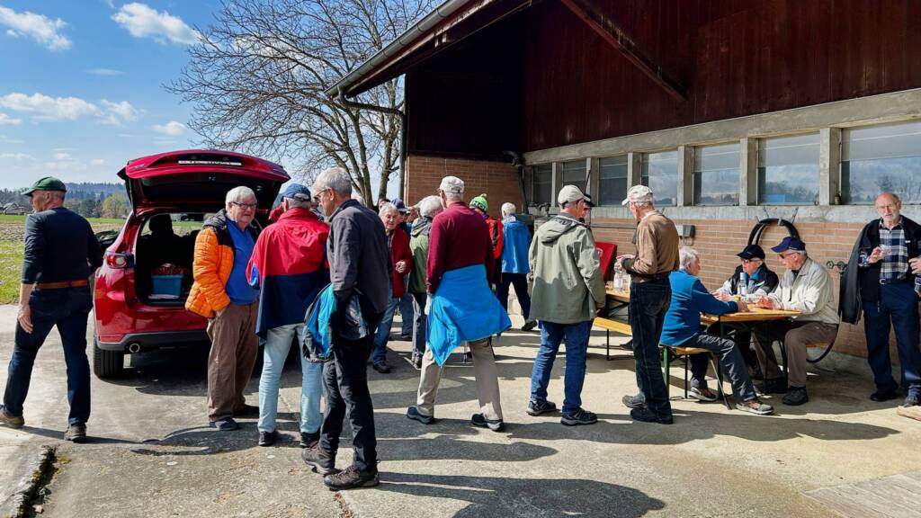Hier hatte Köbi Debrunner den Apero und die farbigen Eier schon bereit gemacht. Es ging nur wenige Minuten und da tauchte auch noch das C mit Röbi Kern auf. Er und fünf Kollegen waren mit der SBB nach Rickenbach und anschliessend mit dem Bus nach Ellikon gefahren und spazierten dann ebenfalls zum Langfurihof.