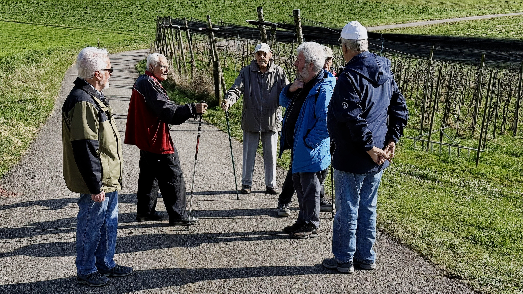 Die 17-köpfige B-Gruppe mit Hans voraus startete beim Weiler Weckingen. Wie das Bild zeigt hatten die Wanderer einen schönen Ausblick nach Herdern. Durch den Wald erreichten sie den Tootebüehl oberhalb der Steigung den die Elite passierte. Nach einer knappen Stunde erreichte diese Gruppe als erste das Tagesziel.