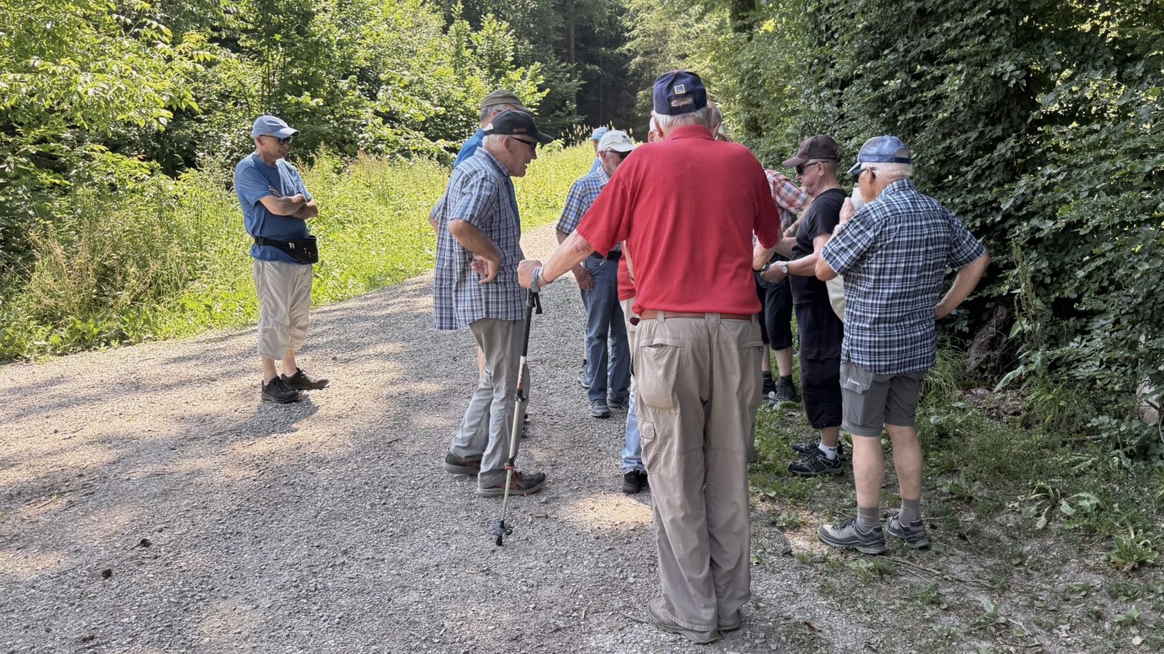 Wir B-ler mit Peter voraus marschierten zuerst in der prallen Sonne, muss man ja, wenn es keine Bäume hat, zuerst in südliche Richtung. Kurz vor Baltlehausen gabs am Schatten den ersten Marschhalt. Peter bog danach links ab und fand einen Schatten spendenden Wald. Nach diesem Wald, ebenfalls am Schatten gabs den zweiten Marschhalt. Hier versorgte uns Peter mit etwas kühlendem Wasser. Danke vielmol.