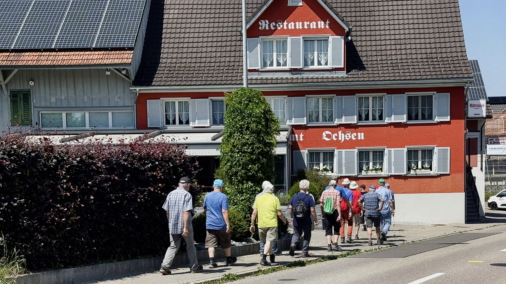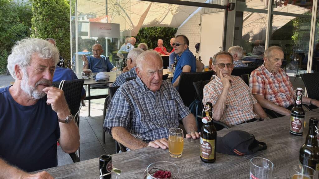 Ab hier gings nonstop bis zum Tagesziel, dem Restaurant Ochsen in Bänikon. Auf der schönen Terrasse waren wir bald mit Tranksame und sehr feudal, mit auf Teller servierten Nussgipfeln versorgt. Bis auf die vier Jasser, die es auch in der Wärme genossen, machten sich alle mit dem Postauto um 16.11 Uhr auf den Heimweg. Das es beim Blumenkauf noch einiger Biere brauchte war heute selbstverständlich.